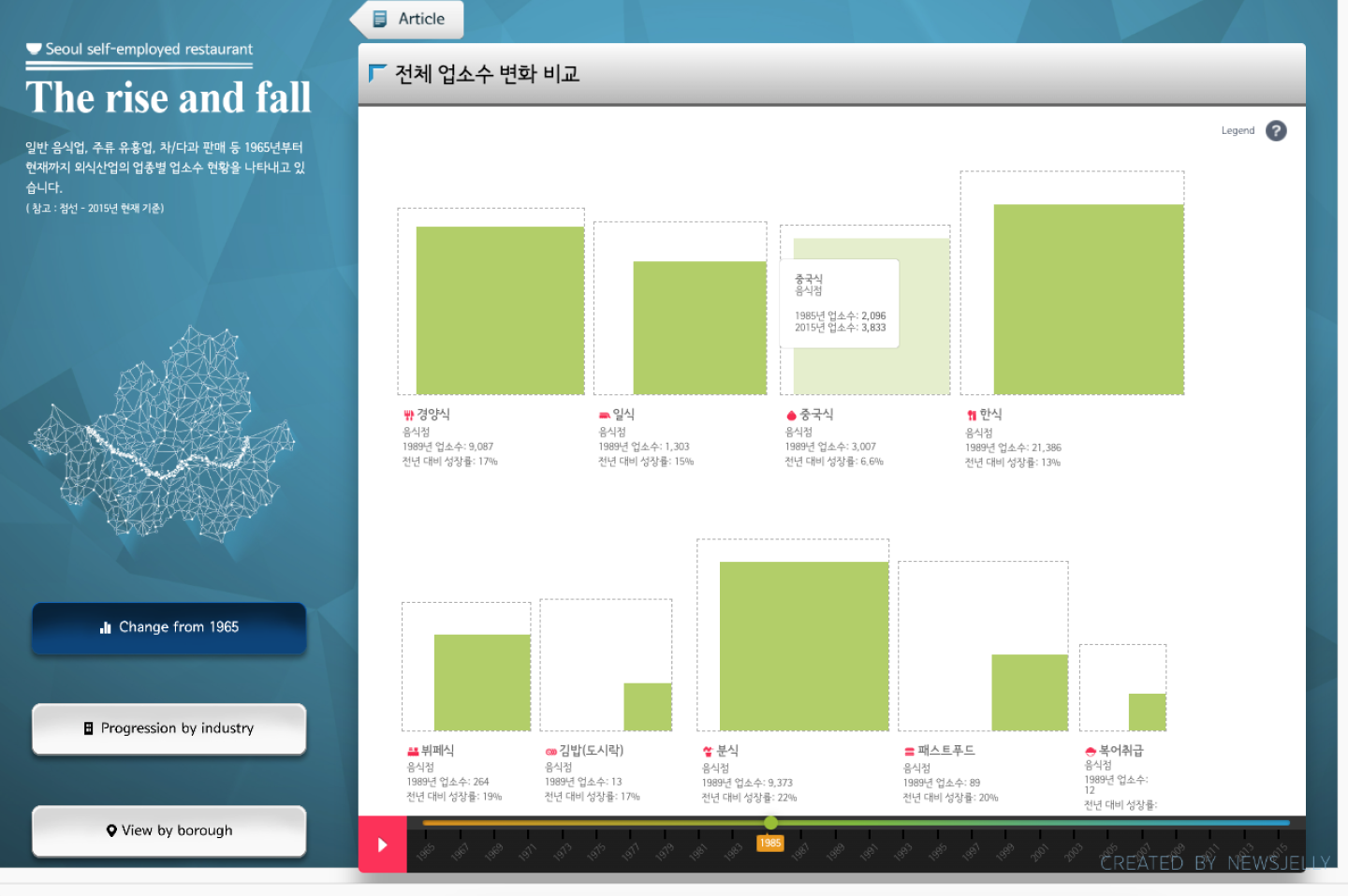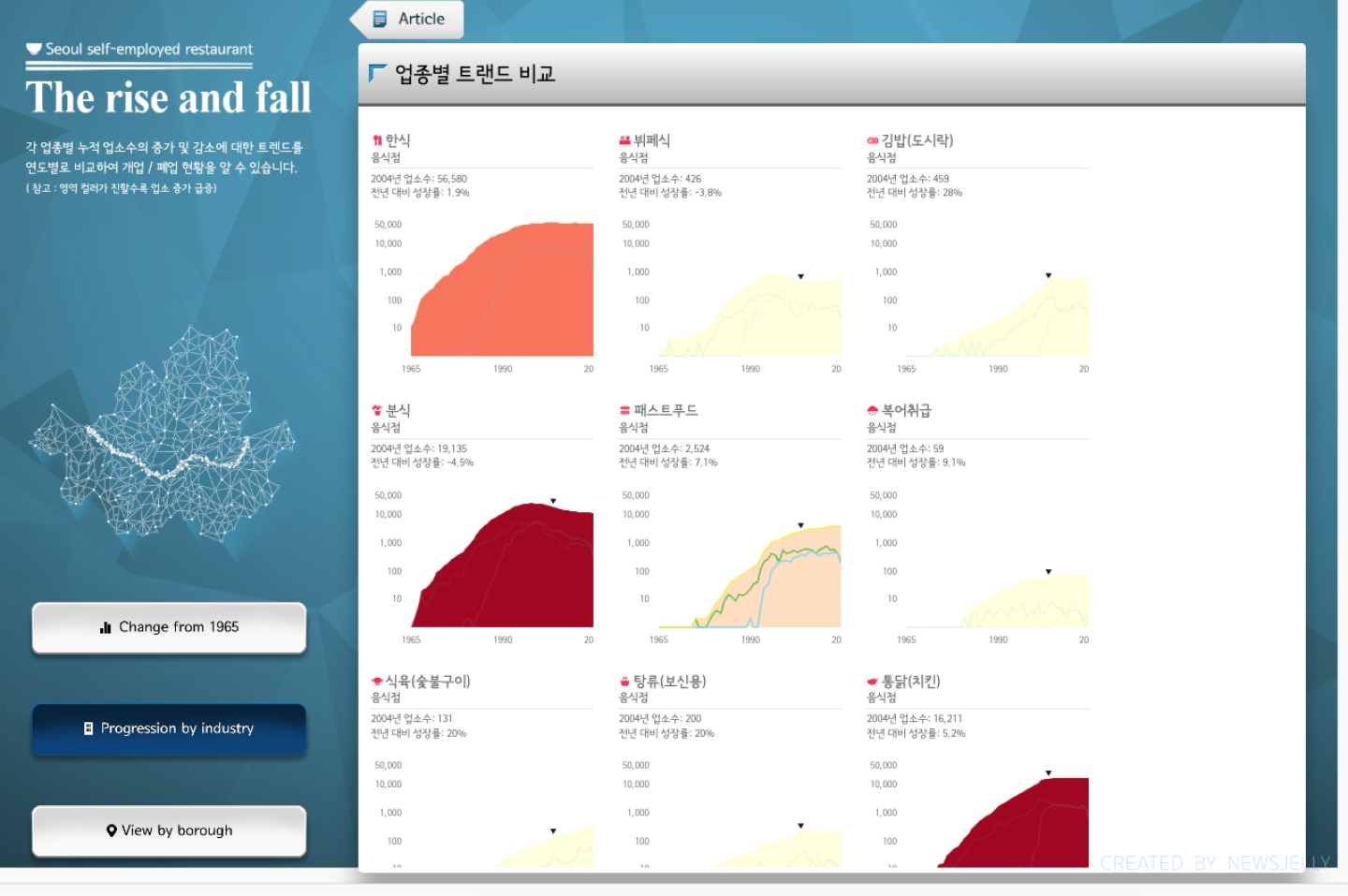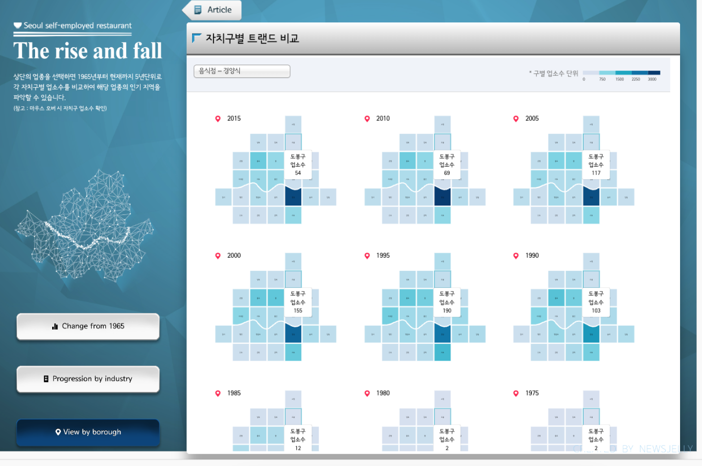 고객사 서울시는 서울시의 자영업 현황을 시각적으로 전달할 수 있는 인터랙티브 콘텐츠를 제작하여 서울시청 내 디스플레이와 서울시청 홈페이지에 게재하고자 하였습니다. 이는 시민을 비롯해 자영업자와 예비 창업자들에게 인사이트를 제공하여 이들의 성공적인 창업을 지원하는 것을 목표로 하였습니다. 1965년부터 2015년까지 50년간의 서울시 자치구별X업종별 개폐업 업소수 데이터를 활용하여 시기별 및 지역별 현황을 제공하였습니다.