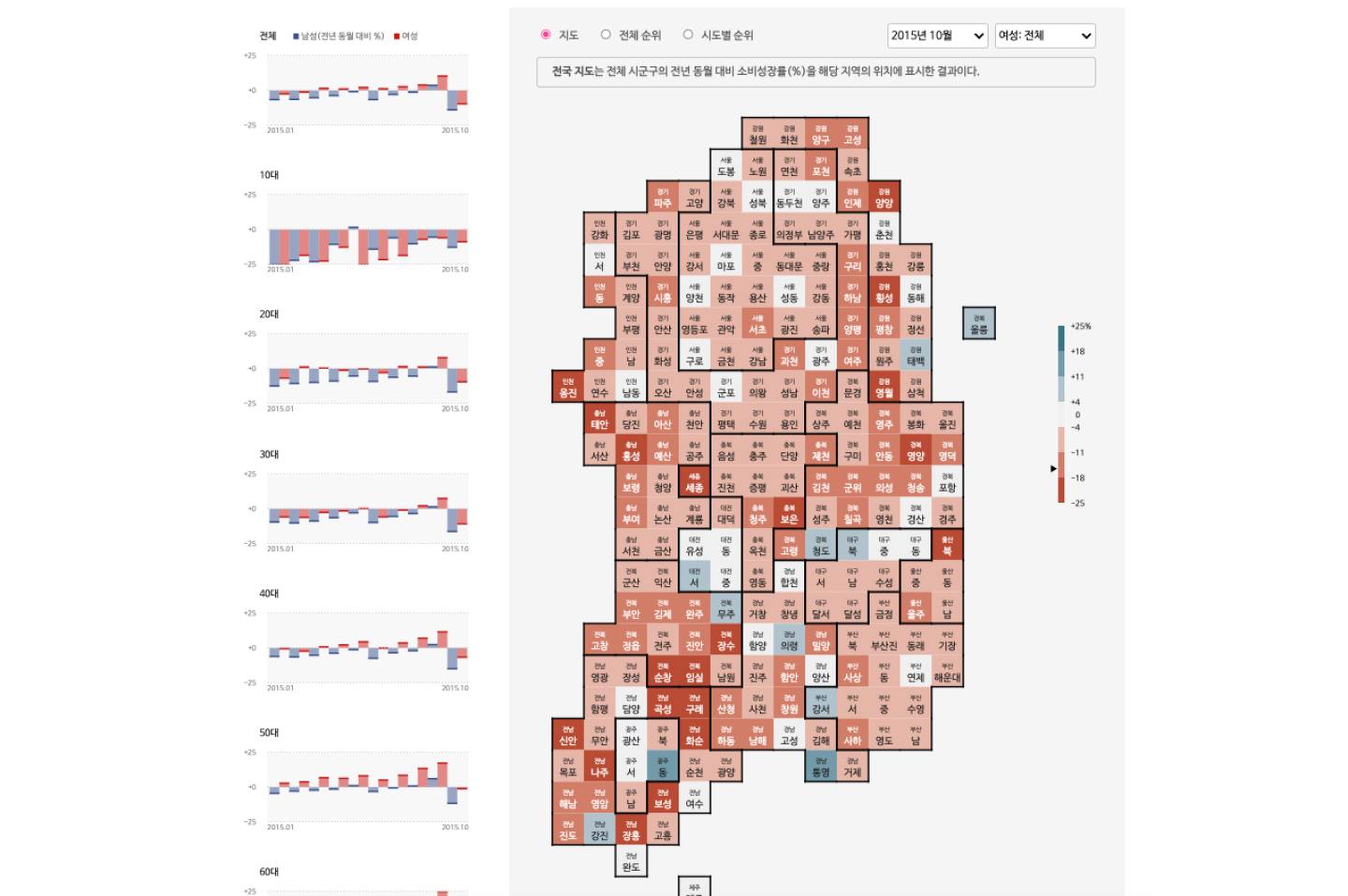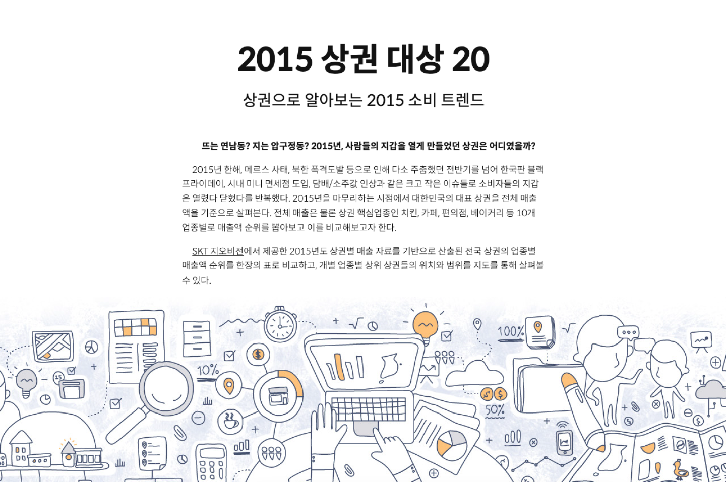 <2015 상권 대상 20 - 상권으로 알아보는 2015 소비 트렌드> 콘텐츠는 전국 상권의 업종별 매출액 순위를 한눈에 볼 수 있는 인터랙티브 시각화 표로 제작하였습니다. <대한민국 상권랭킹> 콘텐츠는 주요 상권 30곳의 월별 매출 데이터 기반 지역별 매출 데이터를 비교해 볼 수 있도록 인터랙티브 시각화 차트를 제작했습니다. 상권별 지도 시각화뿐만 아니라 상권별 상위 업종 순위, 유동 인구 데이터를 부가적으로 제공합니다. <대한민국 얼마나 썼을까?> 콘텐츠는 전국 소매업계의 매출액과 소비액을 지수화하여 인터랙티브 차트 및 지도 시각화로 제작하였습니다.