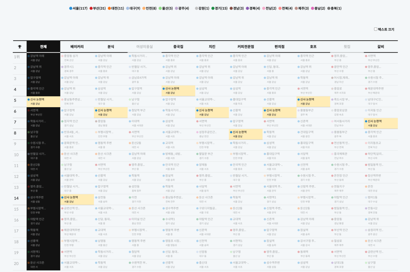 <2015 상권 대상 20 - 상권으로 알아보는 2015 소비 트렌드> 콘텐츠는 인터랙티브 시각화 표로 제작되어, 사용자가 마우스 오버하는 위치의 데이터에 따라 관련 데이터만 하이라이팅되도록 하였습니다. 동일 업종 및 동일 지역의 데이터가 순위별 업종별로 어떻게 달라지는지 효과적으로 알 수 있습니다.