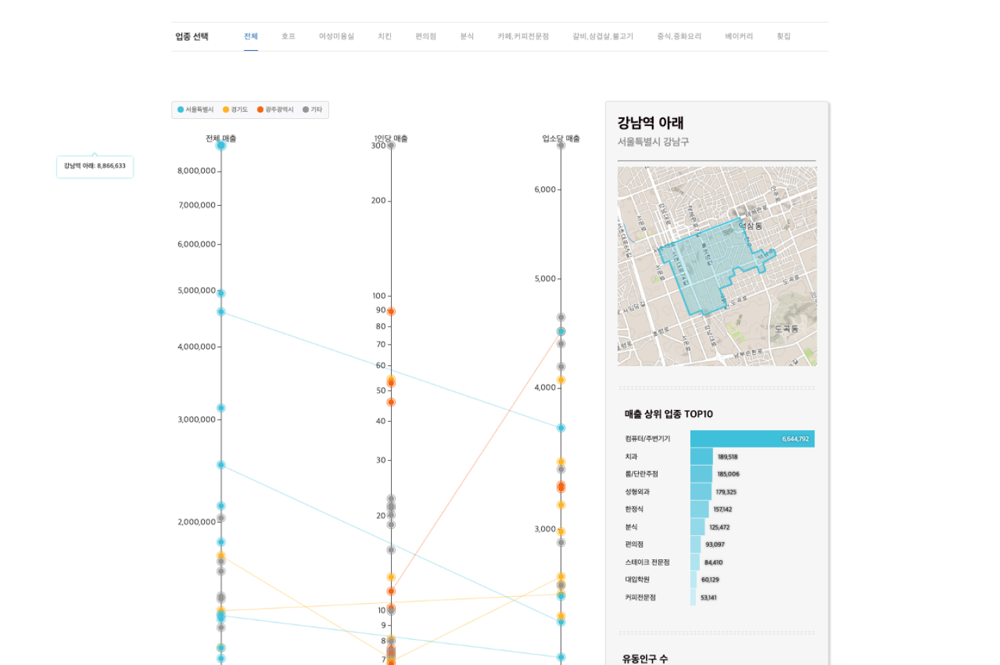 고객사는 2015년 전국 상권의 매출 데이터를 통한 소비 트렌드 분석하고자 하였습니다. SKT 지오비전에서 제공한 2015년 상권별 매출 데이터를 활용하였고, 각 지역 상권의 특성과 소비 패턴을 시각적으로 파악할 수 있는 인터랙티브 시각화 콘텐츠를 제작하였습니다