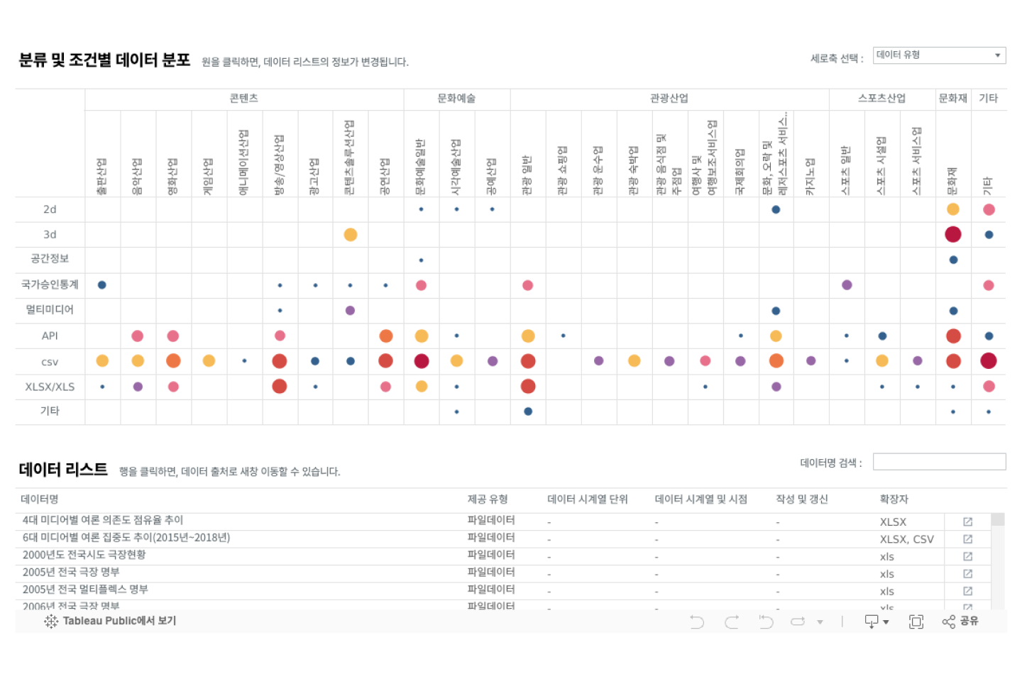 이를 효과적으로 할 수 있는 방법으로 시각화를 선택했고, 효율성을 고려해 시각화 BI Tableau Public을 활용해 대시보드를 제작 및 발행하였습니다. 조건별 지표의 비중 시각화는 XY히트맵을 변형한 형태로 구성하여 각 조건별 데이터의 크기를 원의 사이즈로 표현하였습니다. 개별 조건에 해당하는 지표의 개수가 많을수록 원의 크기가 크게 표현되도록 하였습니다. 또한 가로축은 ‘분야'로 고정하고, 세로축은 ‘작성 기관', ‘데이터 유형' 중 선택할 수 있도록 하여 ‘분야별 X 작성 기관별'분포, ‘분야별 X 데이터 유형별' 분포를 볼 수 있도록 하여 사용자의 데이터 탐색의 범위를 넓혔습니다.