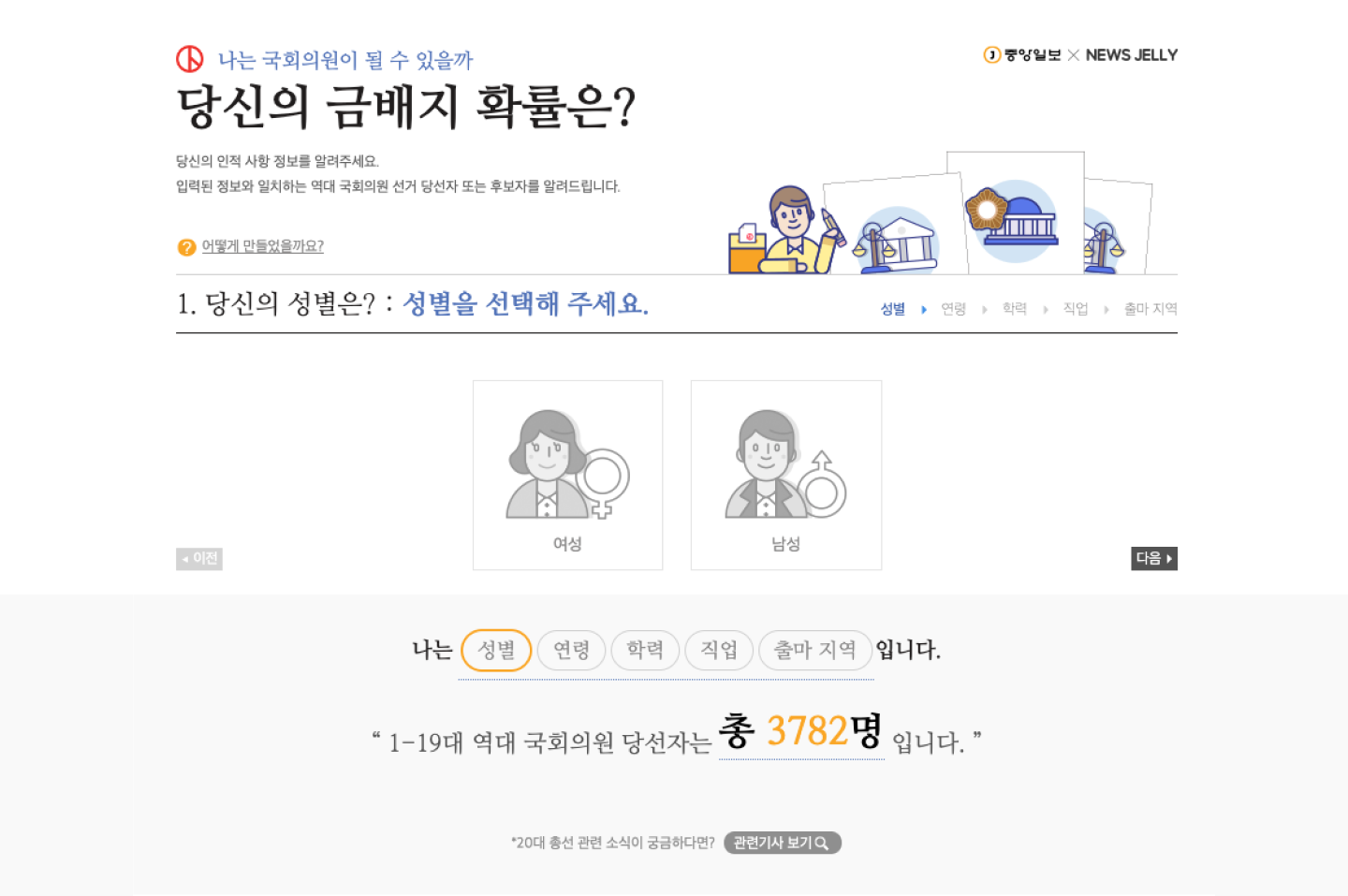 총선과 관련해서 이야기할 수 있는 다양한 주제 중 인터랙티브 콘텐츠의 경험을 극대화 하기 위해서는 주제 역시 독자에게 와닿을 수 있는 주제가 되어야 한다고 생각했습니다. 다양한 아이디어 중 역대 총선 데이터를 바탕으로 ‘내가 만약 출마한다면, 당선할 수 있을지’에 대한 답을 시각화로 확인할 수 있는 콘텐츠를 기획하였습니다.