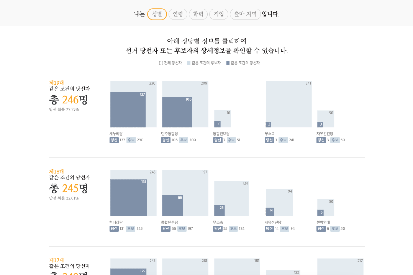 독자가 인적 사항 정보로서 성별, 연령, 학력, 직업, 출마 지역을 입력하면, 동일 조건의 당선자 데이터를 기반으로 맞춤형 결과를 시각화로 볼 수 있도록 하였습니다. 일반 독자가 생각하기에 당선이 되려면 필요하다고 생각할 법한 조건이거나 현재 나의 상황을 대입해 볼 수 있는 항목을 입력 데이터 항목으로 설정하였습니다. 독자가 값을 입력하면, 역대 총선별 당선 확률을 비롯해 같은 조건의 후보자 수, 당선자 수 등에 대한 정보를 시각화로 제공합니다.
