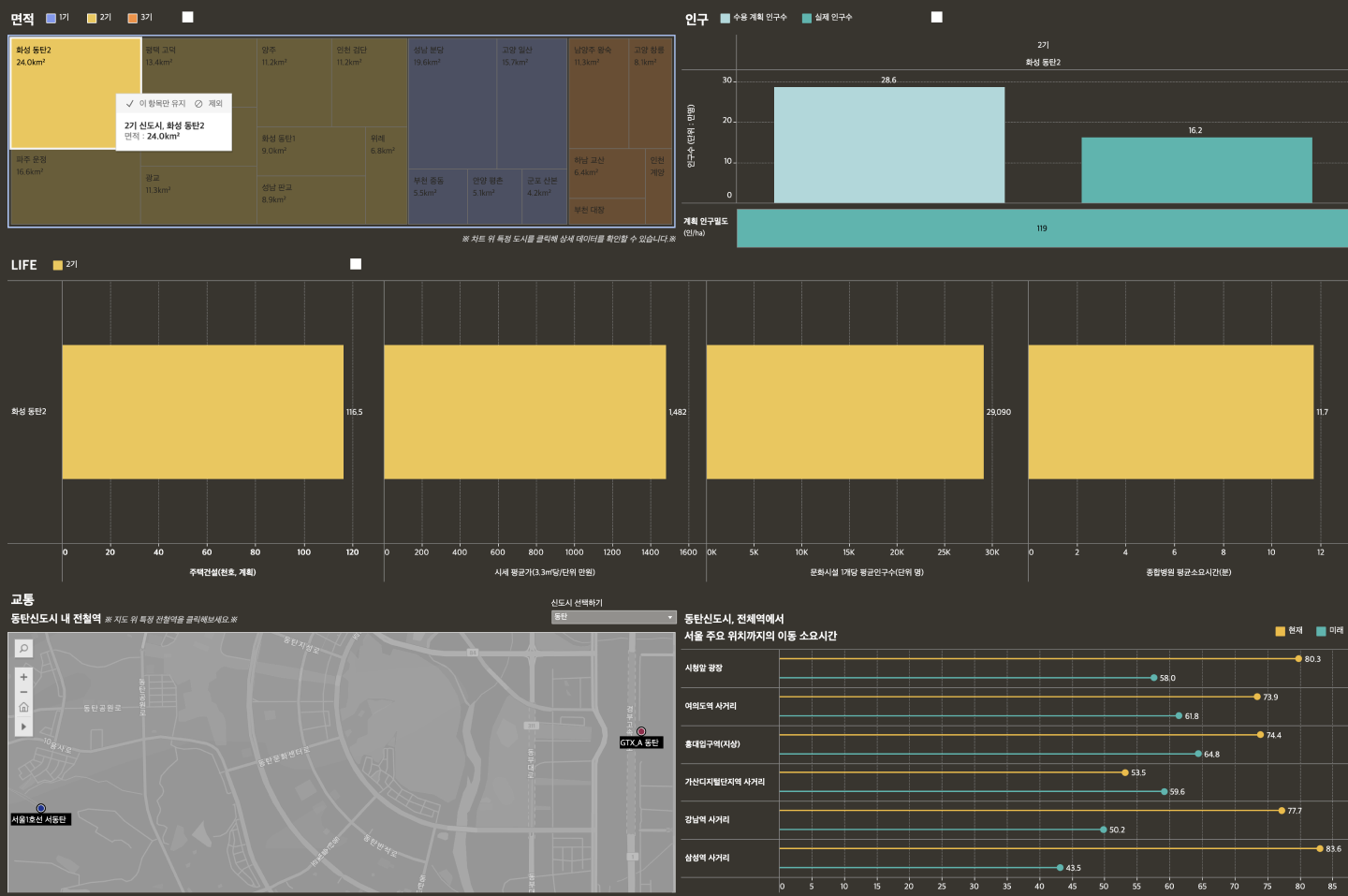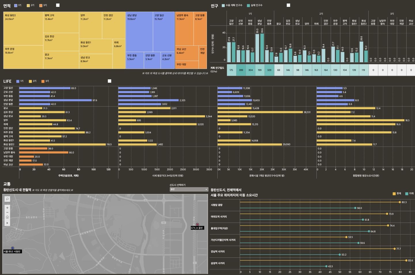 신도시에 대한 정보는 ‘면적, 인구, 생활(LIFE), 교통'의 네 가지 주제로 나누어 시각화와 함께 인사이트를 제공하였습니다. 각 주제별 시각화 차트는 전달하고자 하는 데이터 인사이트에 적합한 유형을 활용하였고, 각 기수별 차이를 직관적으로 알 수 있는 형태로 제작했습니다.