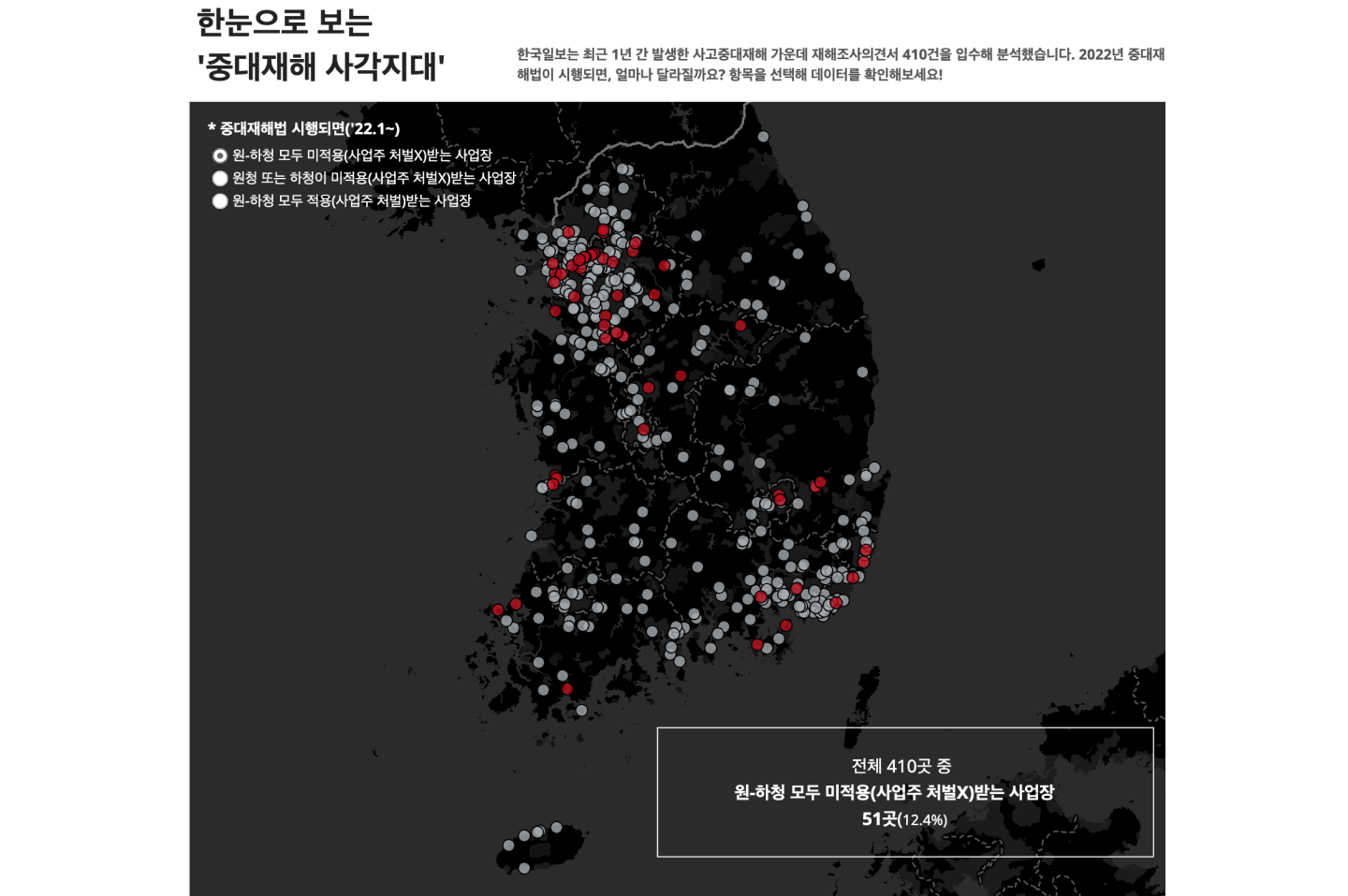 반면, 중대재해법 시행에 따른 변화를 보여주기 위해 제작한 <한 눈으로 보는 ‘중대재해 사각지대'> 대시보드는 단순히 데이터 현황을 보여주기보다, 어떻게 변화하는지를 직관적으로 알 수 있도록 하였습니다. 현재 데이터를 기준으로 지도 시각화상 법 시행 시 사업주가 처벌받게 되는 사업장의 점 컬러를 빨간색으로 변경하여 전체 데이터 중 사업주 처벌 사업장의 비중을 직관적으로 알 수 있게 하였습니다. 더불어 지도 오른쪽 하단에 데이터 인사이트를 요약하는 텍스트를 넣어 쉽게 이해할 수 있도록 하였습니다.