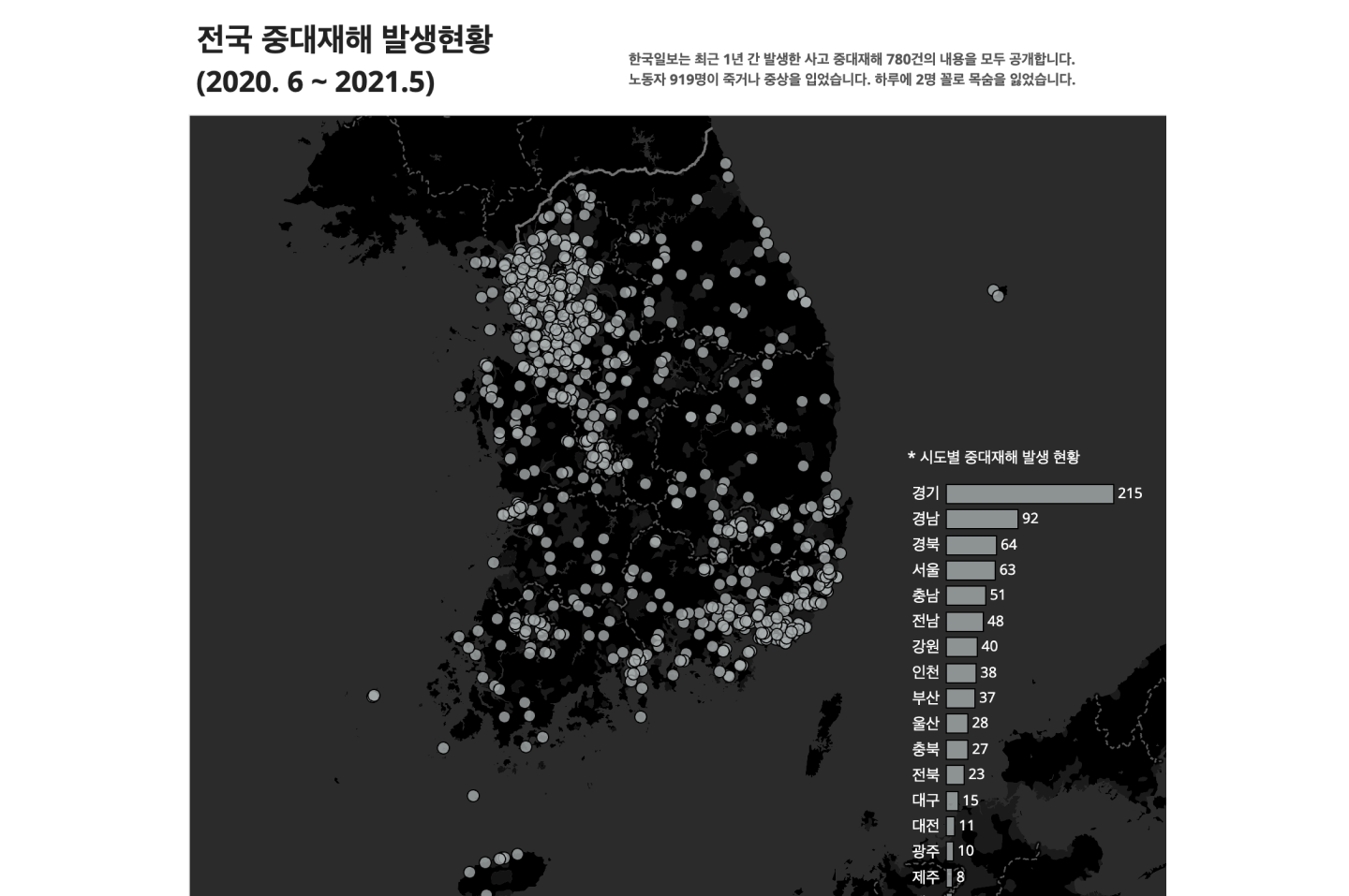 시각화 구축에는 언론사가 2020년 6월부터 2021년 5월까지 중대재해로 분류된 780건 중 정의당 강은미 의원실을 통해 고용노동부가 작성한 410건의 재해조사 의견서를 입수해 해당 기업들의 사업장 규모와 공사 금액(건설업)을 전수조사한 데이터를 활용했습니다.